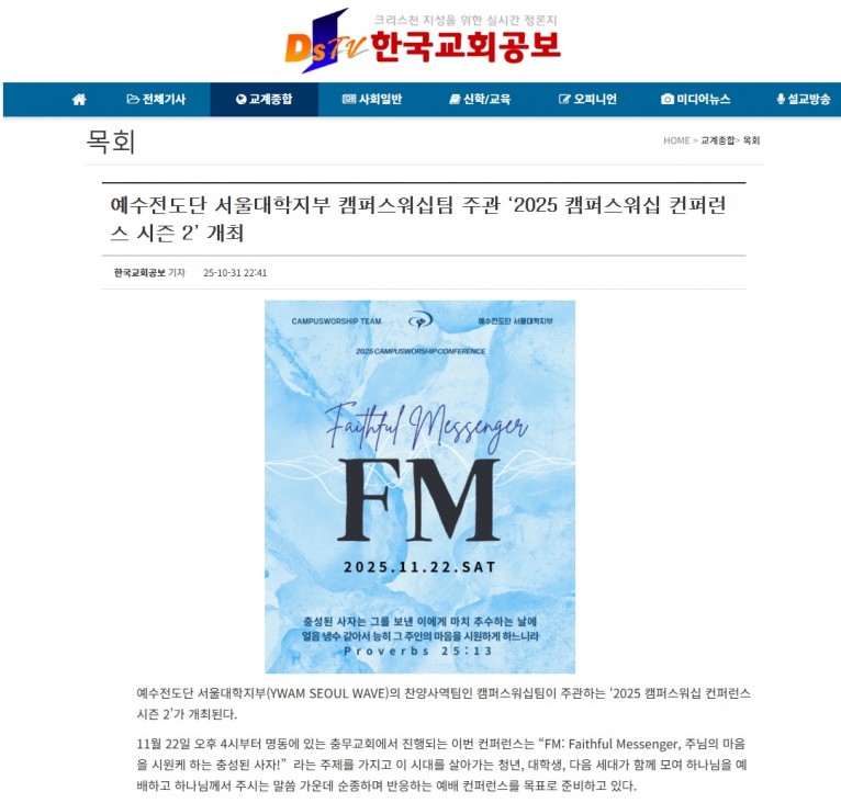 [기사] 예수전도단 서울대학지부 캠퍼스워십팀 주관 ‘2025 캠퍼스워십 컨퍼런스 시즌 2’ 개최(한국교회공보)