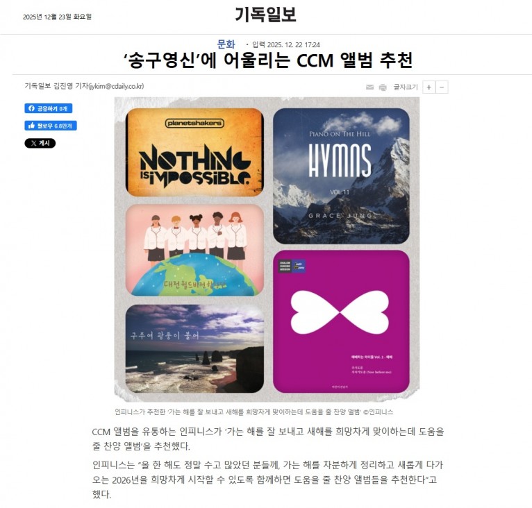 인피니스는 “올 한 해도 정말 수고 많았던 분들께, 가는 해를 차분하게 정리하고 새롭게 다가오는 2026년을 희망차게 시작할 수 있도록 함께하면 도움을 줄 찬양 앨범들을 추천한다”고 했다.