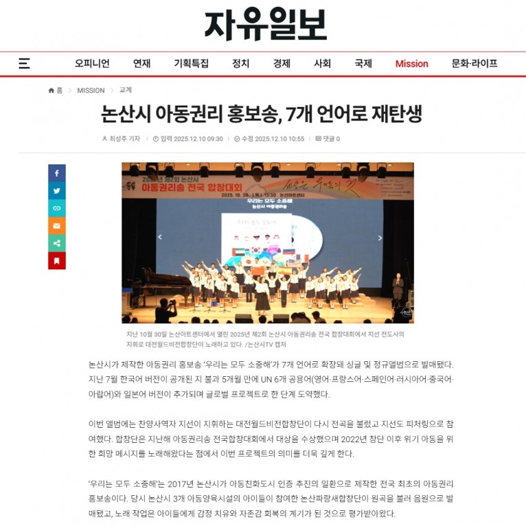 [기사] 논산시 아동권리 홍보송, 7개 언어로 재탄생(자유일보)