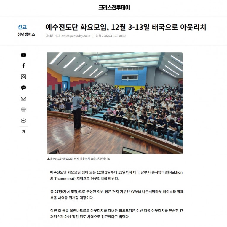 [기사] 예수전도단 화요모임, 12월 3-13일 태국으로 아웃리치(크리스천투데이)