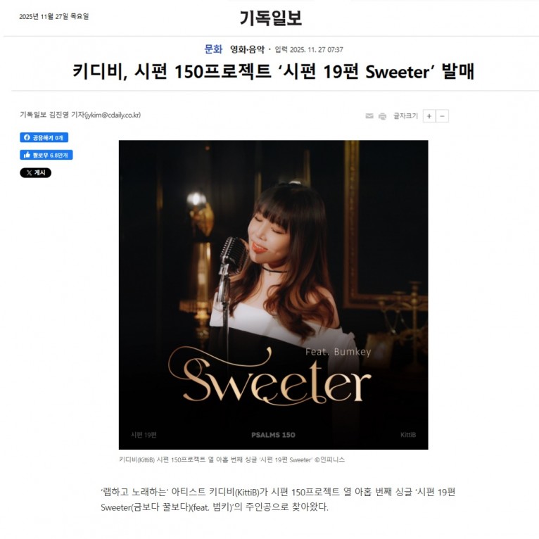 [기사] 키디비, 시편 150프로젝트 '시편 19편 Sweeter' 발매(기독일보)