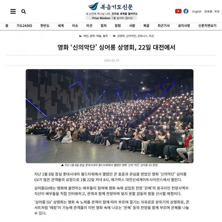 [기사] 영화 ‘신의악단’ 싱어롱 상영회, 22일 대전에서(복음기도신문)